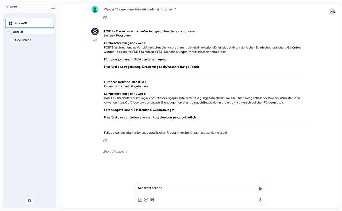 Ein besonders praxisnahes Einsatzszenario von Mikis ist die FörderKI – eine spezialisierte Plattform zur gezielten Suche nach Förderprogrammen auf Gemeinde-, Landes-, Bundes- und EU-Ebene.